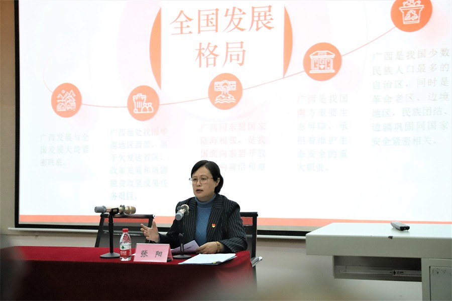 会上,张阳书记围绕自治区第十二次党代会的召开背景、主要精神及重要成果等方面,对大会精神进行了系统深入的阐释。她指出,大会系统谋划了自治区未来五年和今后一个时期的工作思路、总体要求、奋斗目标、战略任务和重大举措,确立了凝心聚力建设新时代中国特色社会主义壮美广西“1+1+4+3+N”目标任务体系,为当前和今后一个时期广西的发展描绘了全景图、路线图、施工图。大会把广西发展与全国发展大局紧密联系起来,与新时代中国特色社会主义伟大事业紧密联系起来,与中华民族复兴战略全局紧密联系起来,为凝心聚力建设新时代中国特色社会主义壮美广西提供了基本遵循。