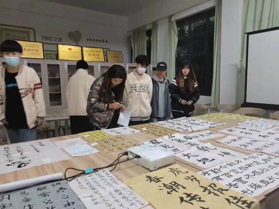 老师们相互交流,仔细品读作品并为本次活动最终评选出届时参加活动的志愿者。 此次活动,为有书法爱好的大学生提供一个展示自我及交流的平台,不仅是对中华民族传统民俗文化的传承,也是对青少年精神文明素养的一种提升。