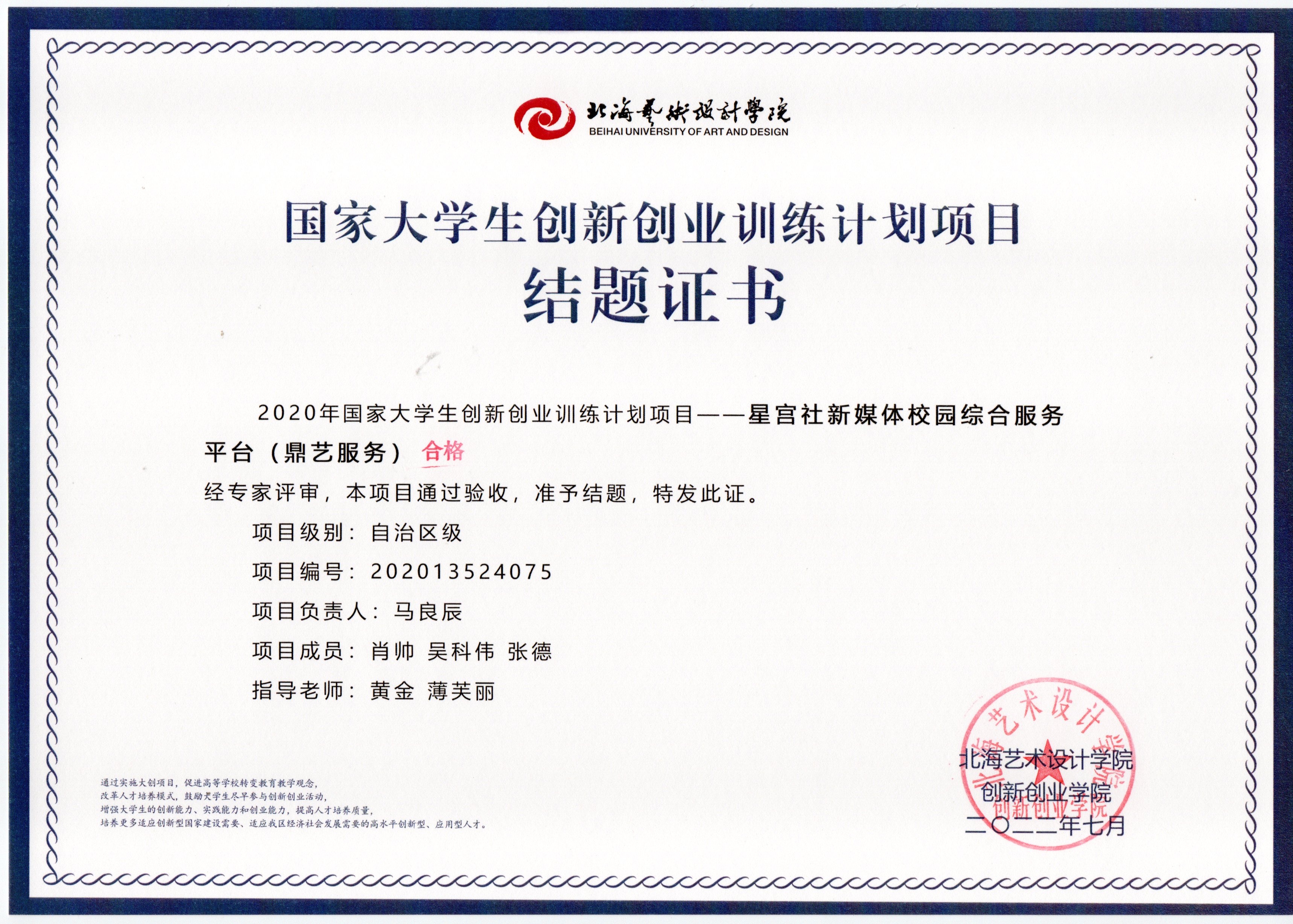 2022年大创项目结题证书(2020立项)