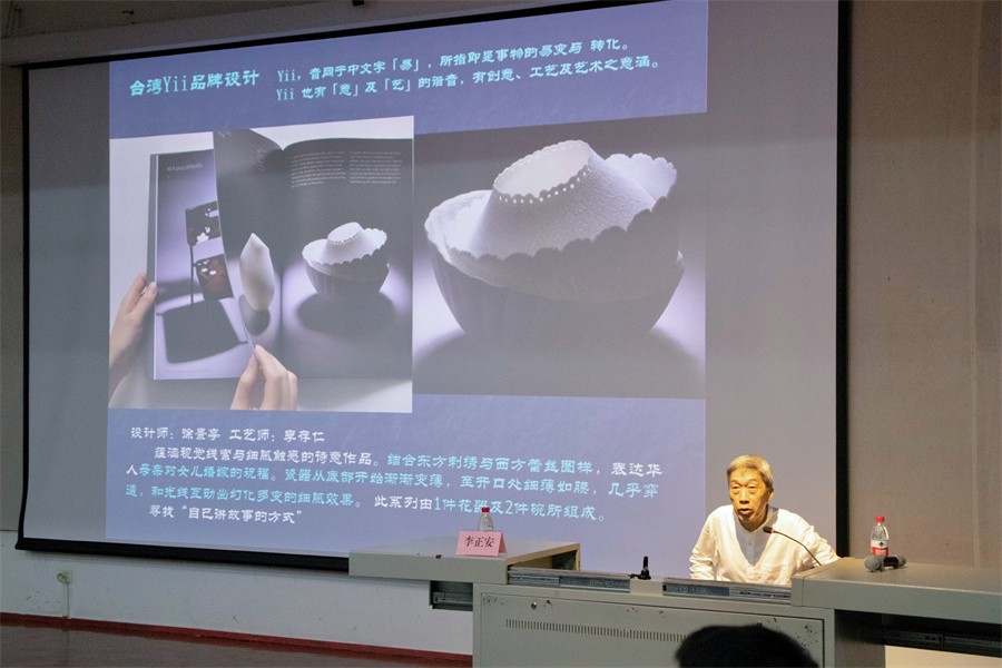 在文创“传统而新颖的资讯”“合理而动人的故事”“材美与工巧的制作”“美好而宜人的产品”“顺畅而舒心的推广”的五大基本要求中,李正安教授表示,一个优秀的文创作品,不仅需要有创新,还应有“文”的加持,运用精美的材料以及精良的制作工艺,一个实用且美观的产品诞生,最后通过推广进入大众视野。李正安教授还通过列举台湾陶瓷文创设计——法蓝瓷、台湾“瓷嬉工坊”、台湾HAOSHI良事设计、台湾Yii品牌设计以及很多古今中外的艺术品例子,详细介绍了如何去做文创产品设计,使在场的师生更好理解文创的基本要求。