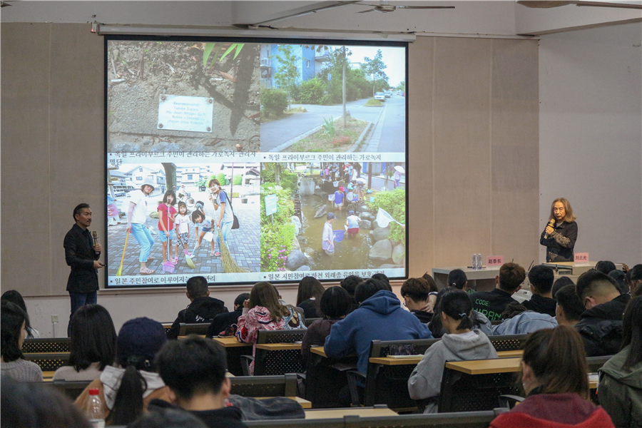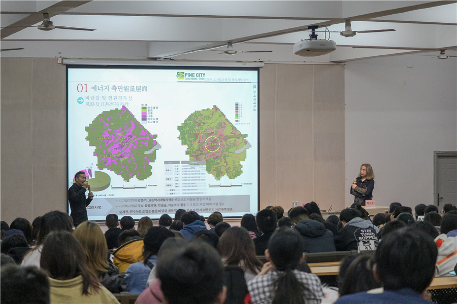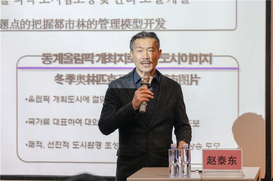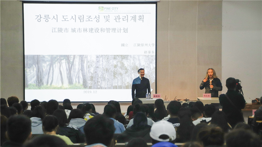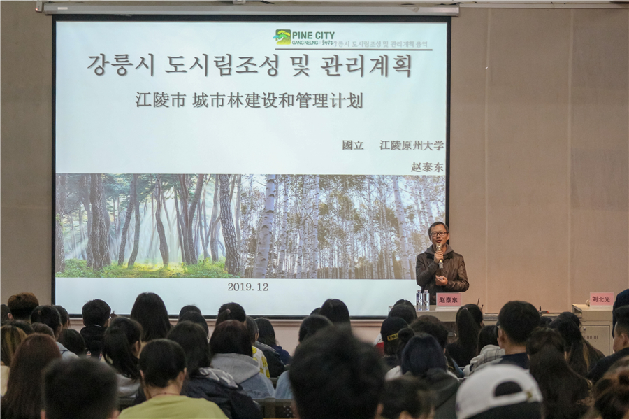 赵泰东教授以“韩国江陵市的城市建设和管理计划”课题为例,讲述了如何改善城市环境以及提高市民生活质量,分析了江原道岭东圈作为中心都市的城市定位,如何利用都市生态特性对城市林业和绿地进行规划设计,如何在设计中展示韩国冬奥会的城市风貌等。