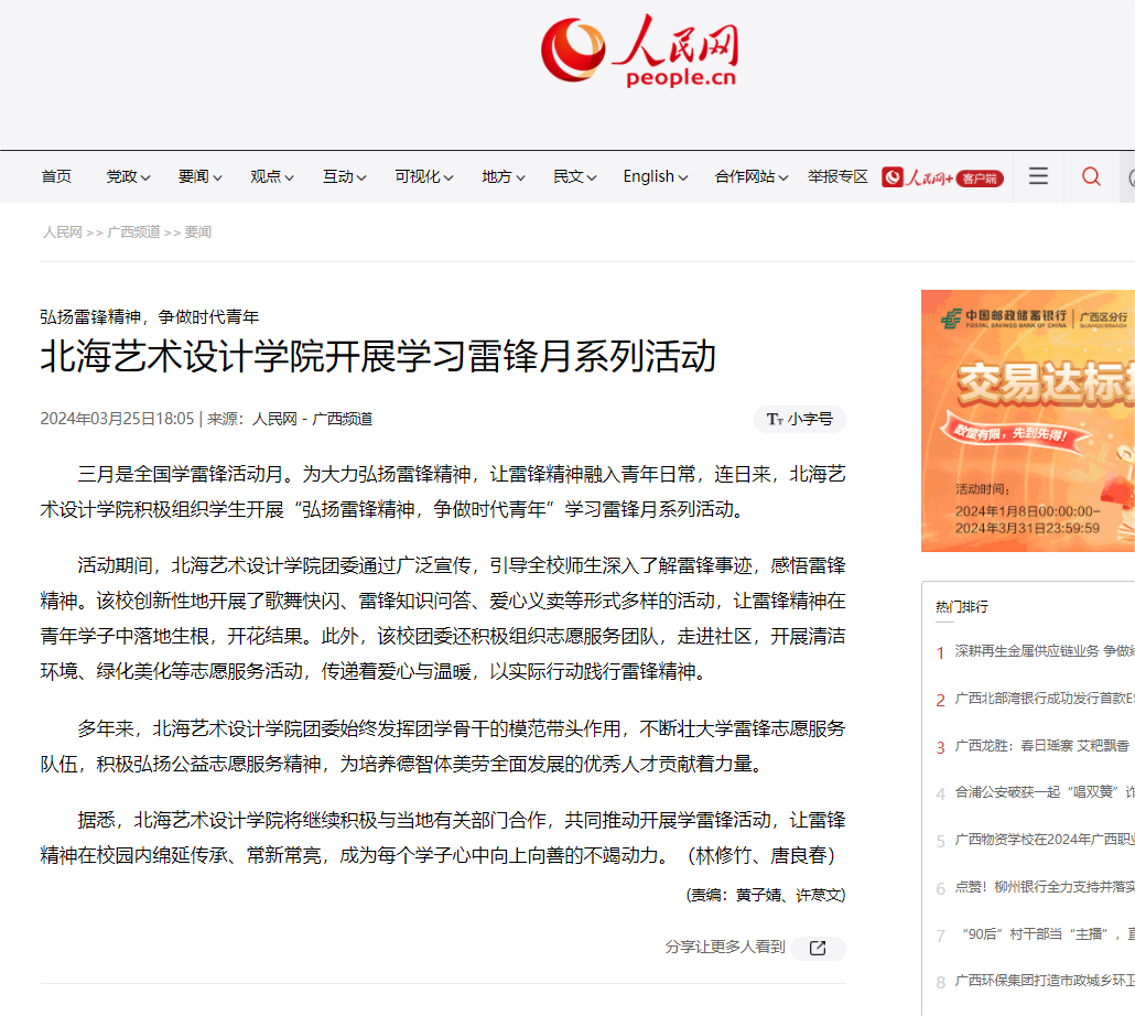 人民网:北海艺术设计学院开展学习雷锋月系列活动