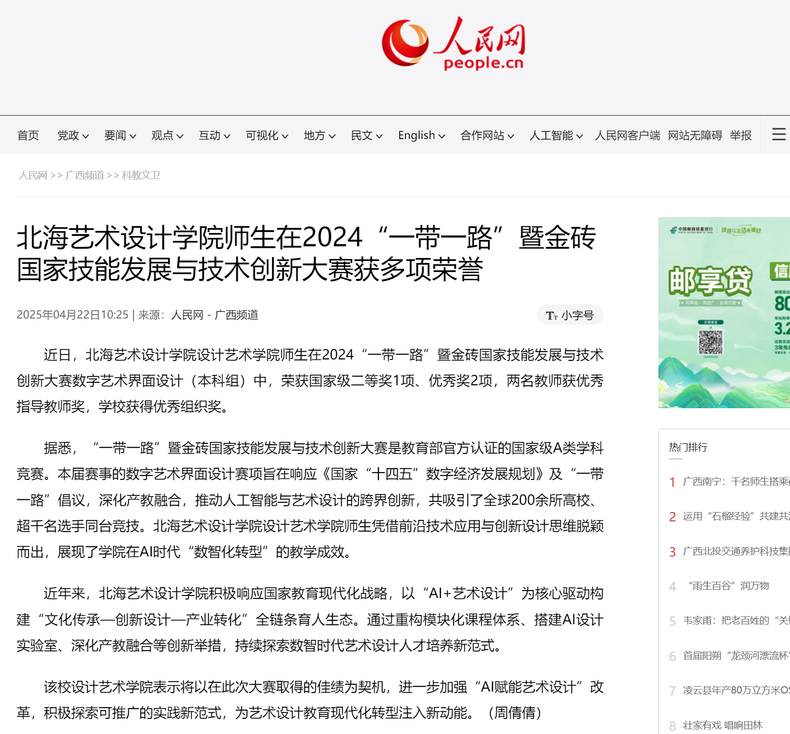 人民网:北海艺术设计学院师生在2024“一带一路”暨金砖国家技能发展与技术创新大赛获多项荣誉