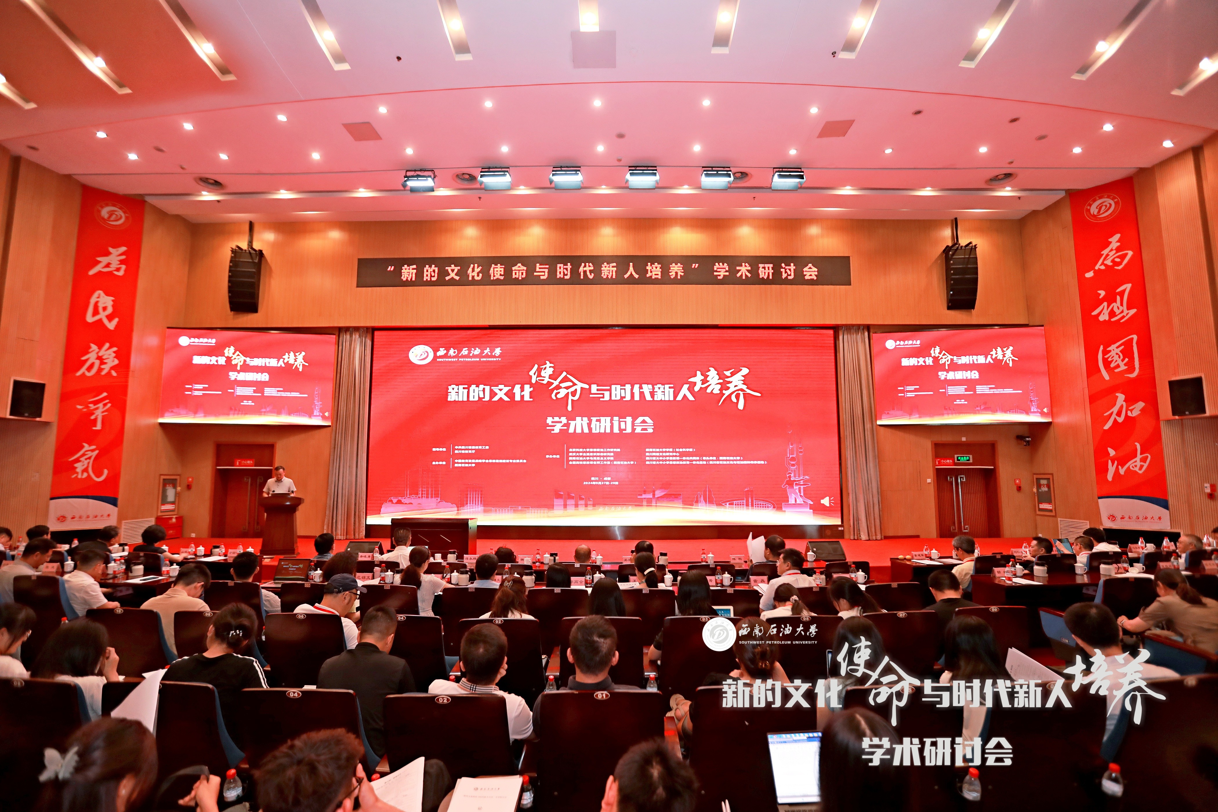 9月28日,由北京科技大学思想政治工作研究院、武汉大学主流意识形态研究院、西南石油大学马克思主义学院、全国高校思政课名师工作室(西南石油大学)、西南石油大学学报(社会科学版)编辑部、四川网络文化研究中心、四川省大中小学思政课一体化共同体(牵头单位:西南石油大学)、四川省大中小学思想政治教育一体化基地(四川省石油文化与石油精神传承基地)联合承办的“新的文化使命与时代新人培养”学术研讨会在西南石油大学(成都校区)召开,四川省委教育工委、省教育厅宣传思想与统战工作处处长李大鹏,西南石油大学党委书记张烈辉出席并致辞。开幕式由西南石油大学党委副书记、工会主席衡彤主持。来自北京科技大学、武汉大学、中山大学、四川大学等80余所高校的师生,以及四川省大中小学思政课一体化共同体的7所中小学教师代表共计500余人参会。