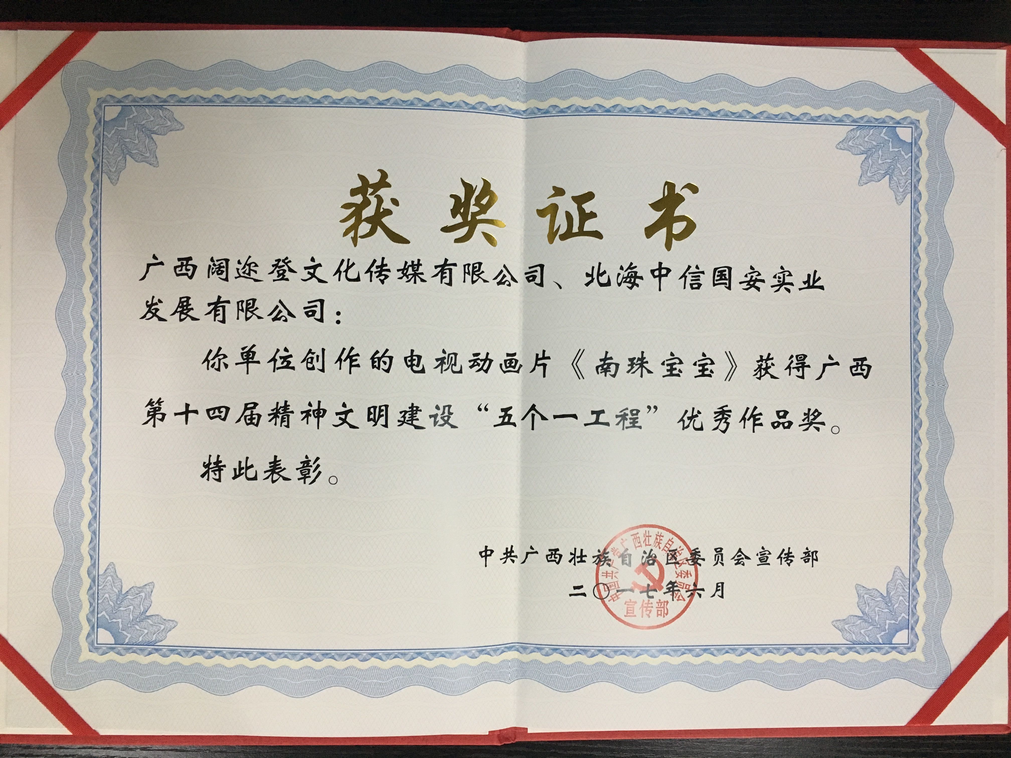 《海上丝路南珠宝宝》广西第十四届精神文明建设“五个一工程”优秀作品奖