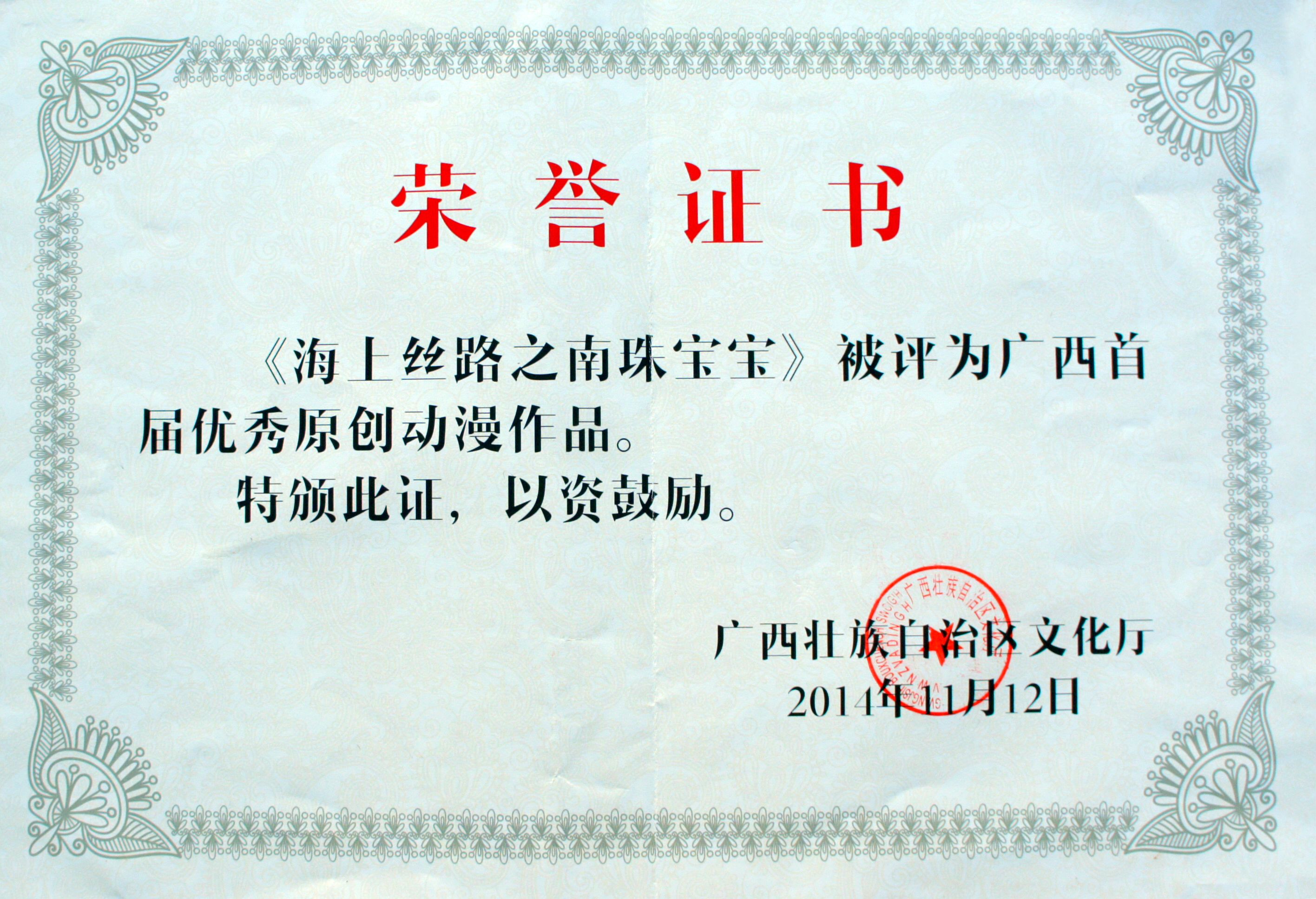 《海上丝路南珠宝宝》广西优秀原创动漫作品奖
