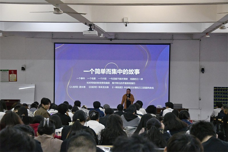 讲座过程中,罗沐教授与现场师生详细分析了国产动画的近年票房与播放量情况。他表示,国产动画片正处于重新崛起的过程中,少量成功与大量淹没的例子,预示着国产动画需要更多的创新作品和优质创作。他鼓励广大师生要勤奋进行短片创作训练,善于思考,不断深入锻炼短片创作中的编导思维,加强创新创作能力。他强调,短片创作训练是多种影视创作的基础单元,短片创作的编导思维也是多种影视创作的核心基础创作思维。罗沐教授以两个动画短片《邮票》和《牠》为例,启发现场师生在进行动画短片创作时,要有一个简单而集中的故事,有一个强而有力的矛盾反转,要“起承转合”从“转”到“合”,要人物与环境单一而纯粹,做到打动人心。他还指出,一个好的故事应该是有闭环、可实现的种子。