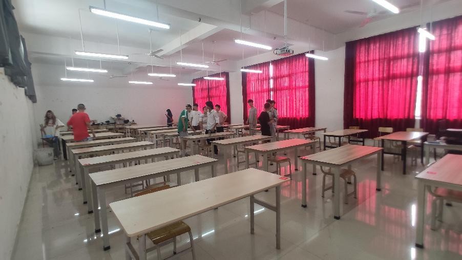 “四,六级考试考场布置”活动。考场布置由学生处安排,在开考之前将教室卫生打扫干净,要求:配齐桌椅数,桌面、黑板、地面要清洁,书籍带走,桌椅尽可能拉开距离,将课桌全部反转,前门入门处放置四张课桌,用来存放考生物品。多余的课桌放在教室后面并排放整齐,不要锁门。监考老师将在开考一小时前到各考场贴考号并封考场,设置警戒线。对整理不符合要求的班级,将要求重新整理。整理结束后请同学们远离警戒区域,更不可随便擅自进入考场。