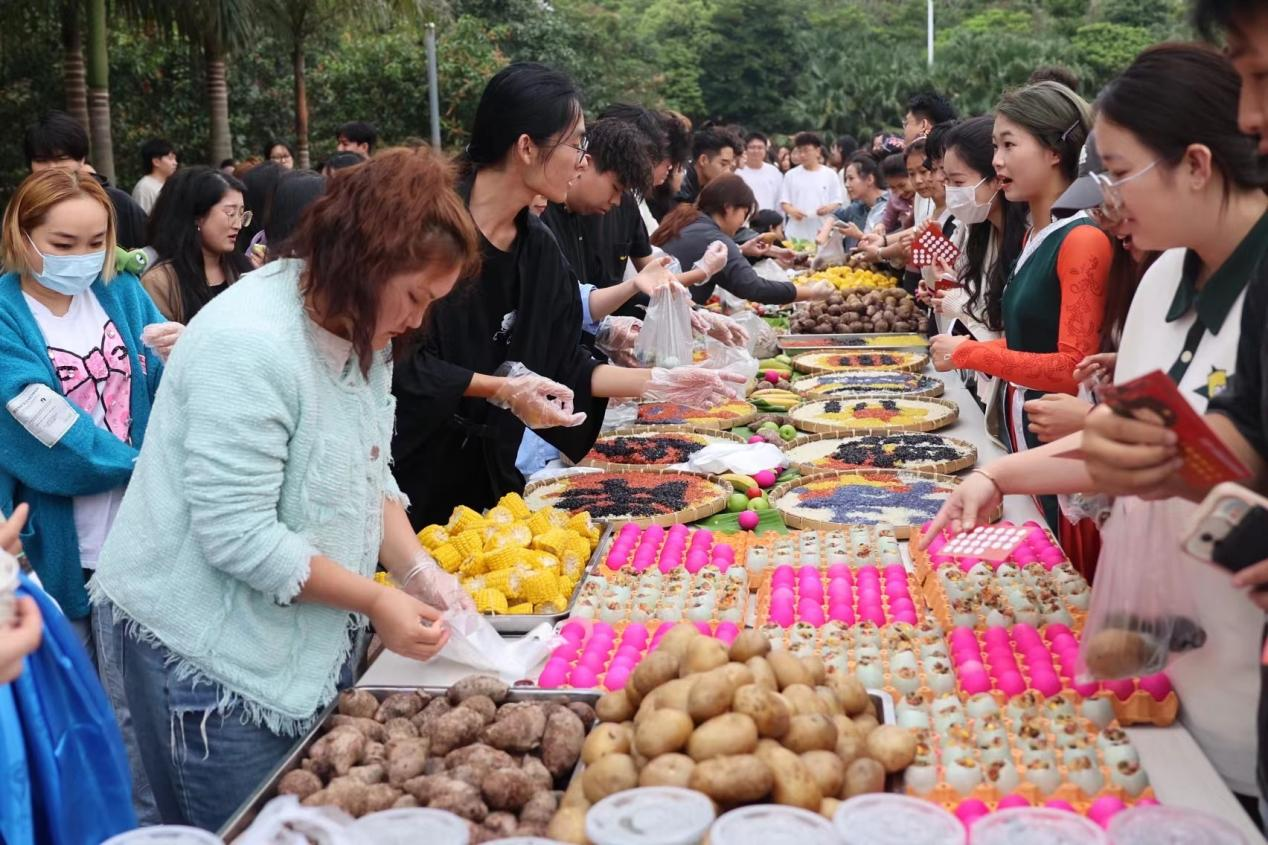 当天,学院师生身着各民族服饰,佩戴精美的配饰,通过民族舞蹈、民族歌曲、民族服装走秀等节目让在场师生“沉浸式”感受到壮乡儿女的独特与风情。此外,还举办了民族文化体验活动,学院师生参加了民族体育竞技、民族美食体验、民族手工艺品展示等活动。现场参与抛绣球、竹竿舞、背篓绣球、溜铁环旱地龙舟、手工绣球制作等民族活动,品尝了具有壮乡特色的民族美食,五色糯米饭、艾叶糍粑、彩蛋等,欣赏到了琳琅满目的民族手工艺品,尽显壮家儿女心灵手巧和热情好客,展现了八桂人民的幸福生活,给现场的师生带来了一场视听盛宴。