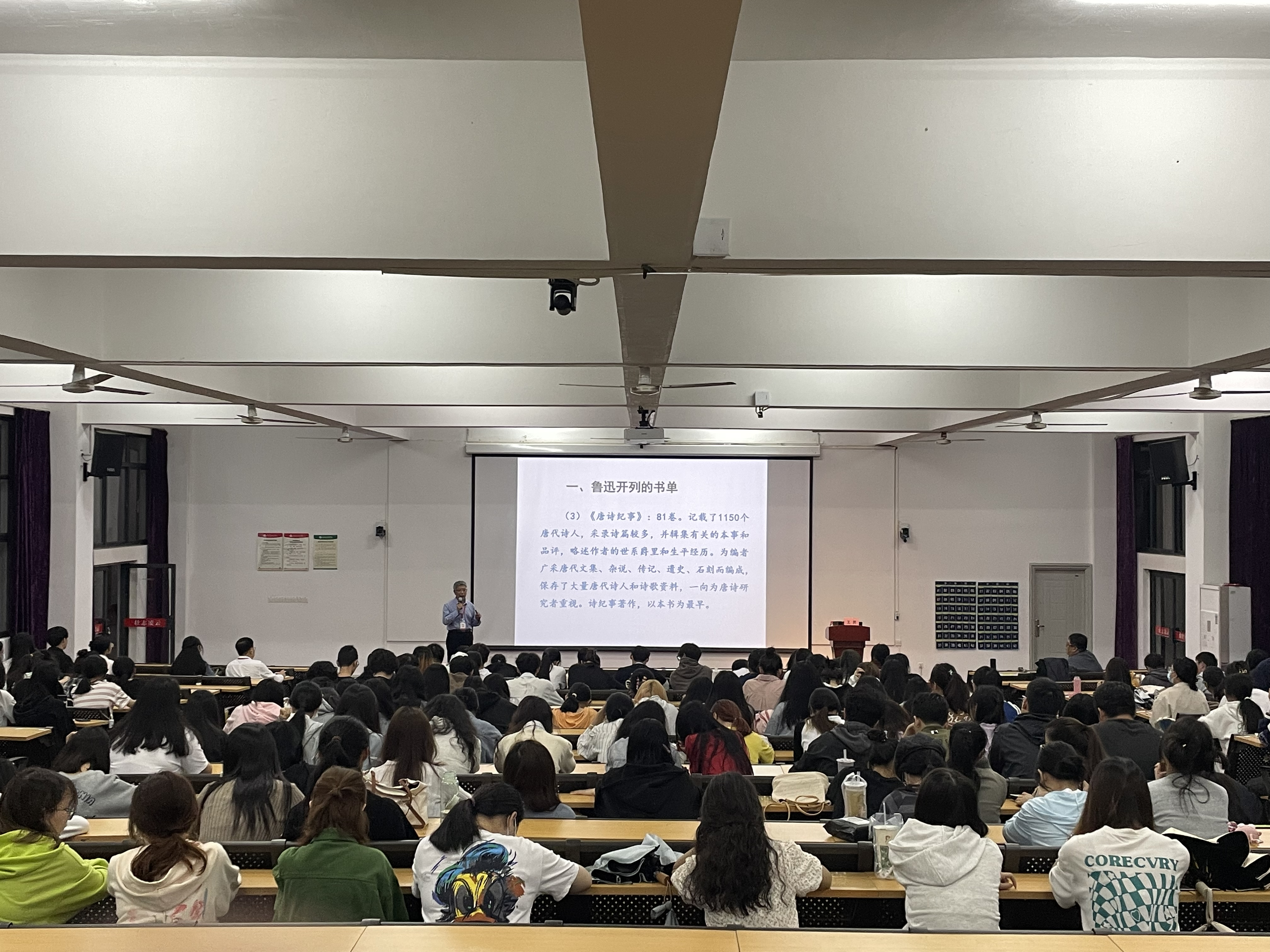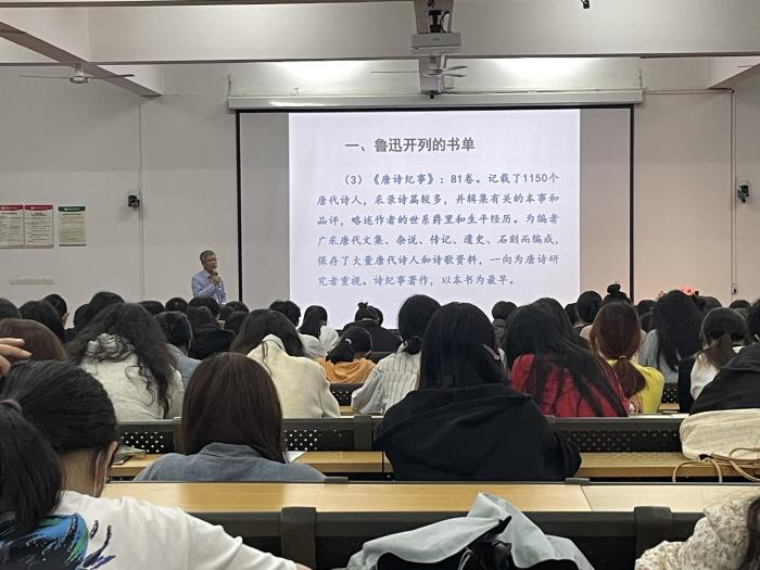王勇教授首先从鲁迅开列的具体书籍谈起,细致独到地讲授了书单中的《唐诗纪事》《唐才子传》《世说新语》等12部书籍,王教授讲解鲁迅列此书单的用意,是为了使同学们明白阅读应当具有选择性。
