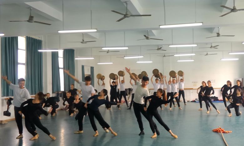 舞蹈表演的同学正在排练具有疍家婚礼特色的舞蹈节目