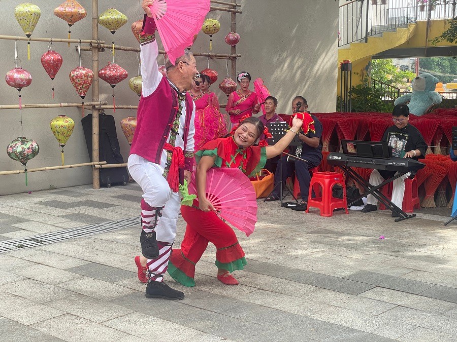 观摩了非物质文化遗产代表性项目合浦县有名歌舞“耍花楼”其表演风格生动诙谐、自由活泼,动律上讲究圆转柔美、自然协调,舞者须随着击打部位的转移不断改变身体倾斜角度,最初演出时无唱腔和乐器伴奏,由艺人自编自唱,同时用舌头和手指弹动的声响伴奏,以增添舞蹈的欢乐气氛。