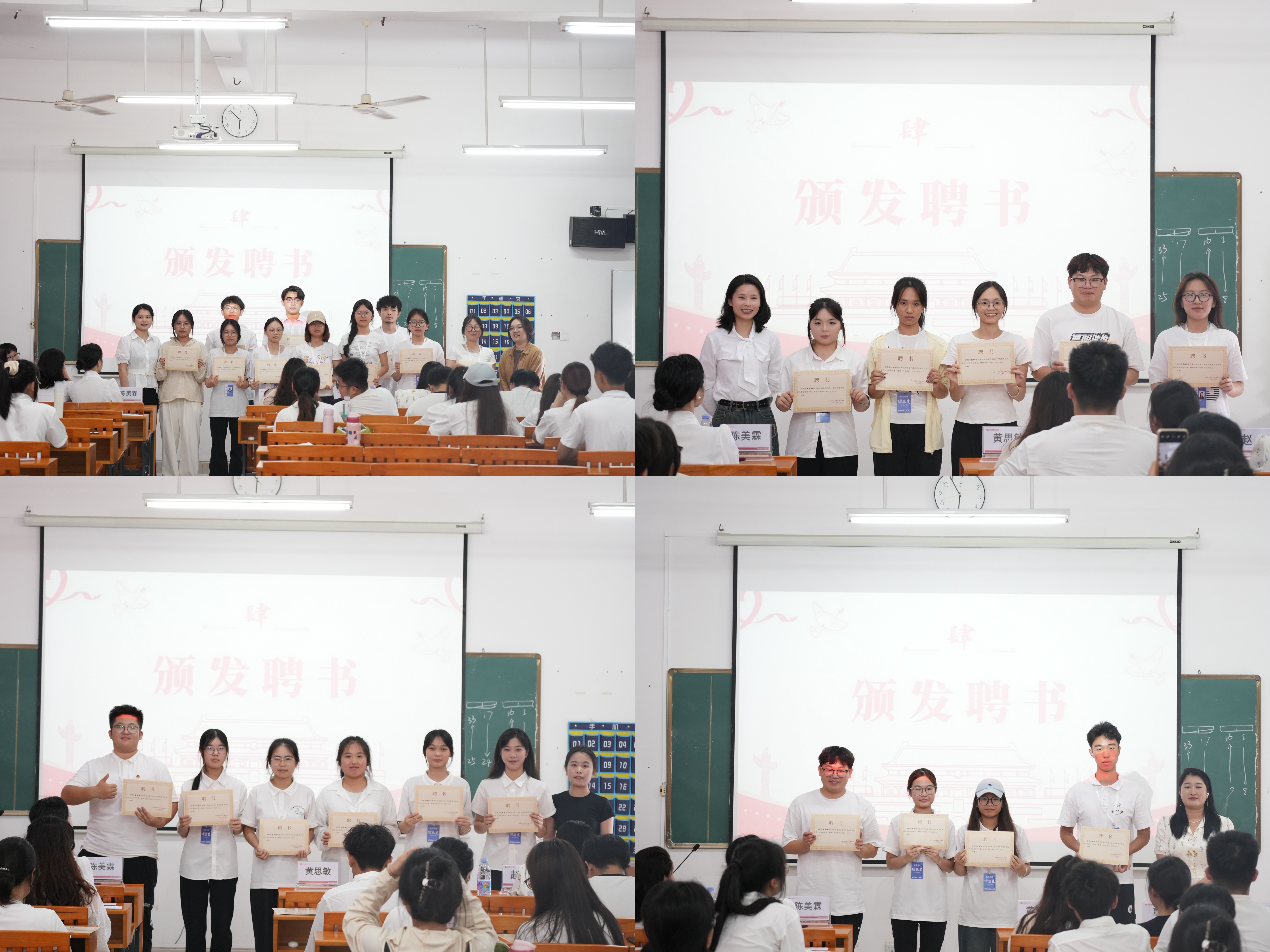 大会第四项议程是为学生干部颁发聘书。各位教师代表为团总支干事颁发聘书,指导老师陈美霖向表现优异的学生干部颁发2024-2025学年第二学期先进个人荣誉证书。一纸证书肯定其在本学期工作中的积极付出与出色表现,更承载着责任与信任,激励学生干部们在未来工作中继续践行初心,为团总支建设贡献力量。 教师代表给学生干部颁发聘书