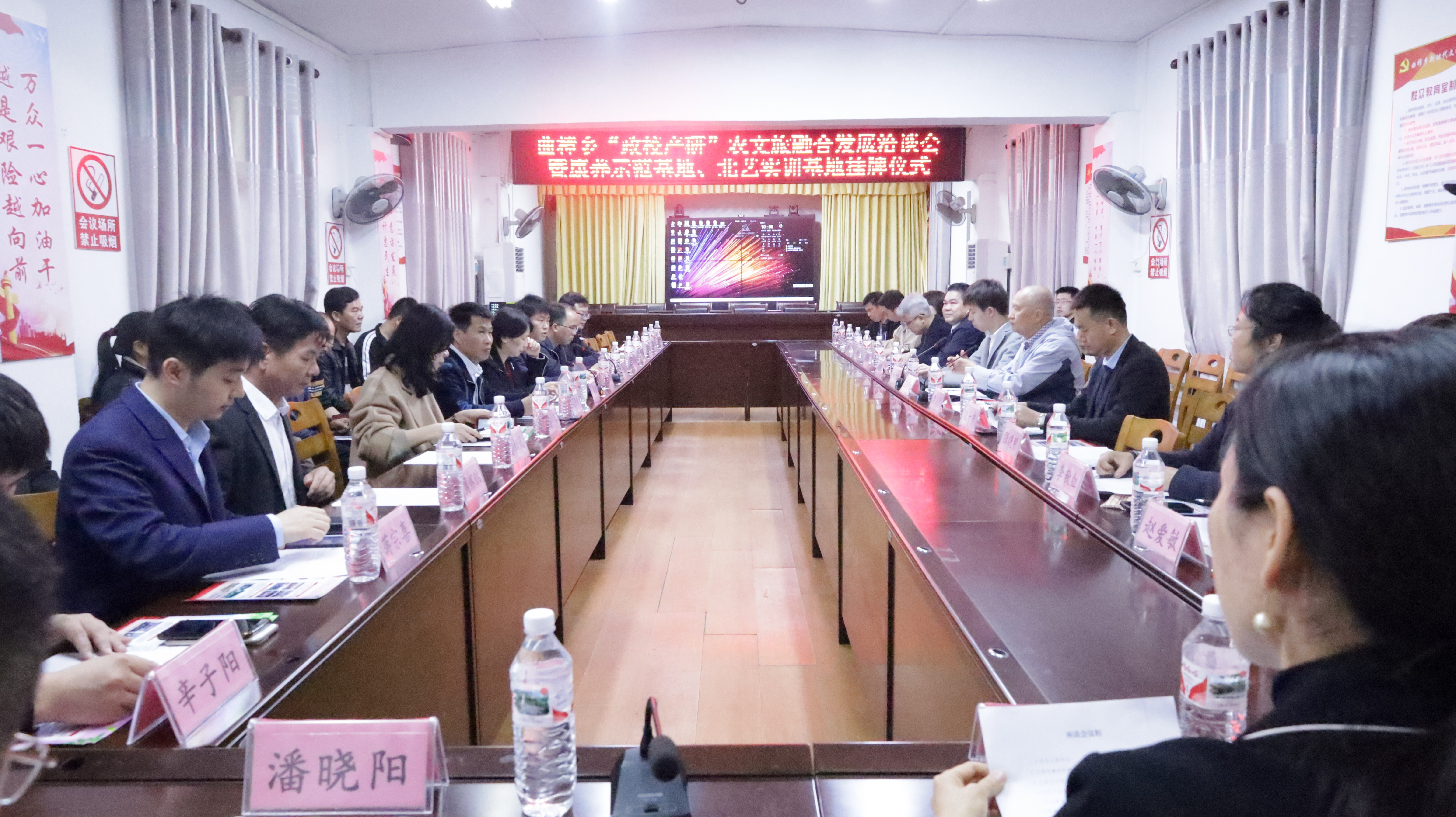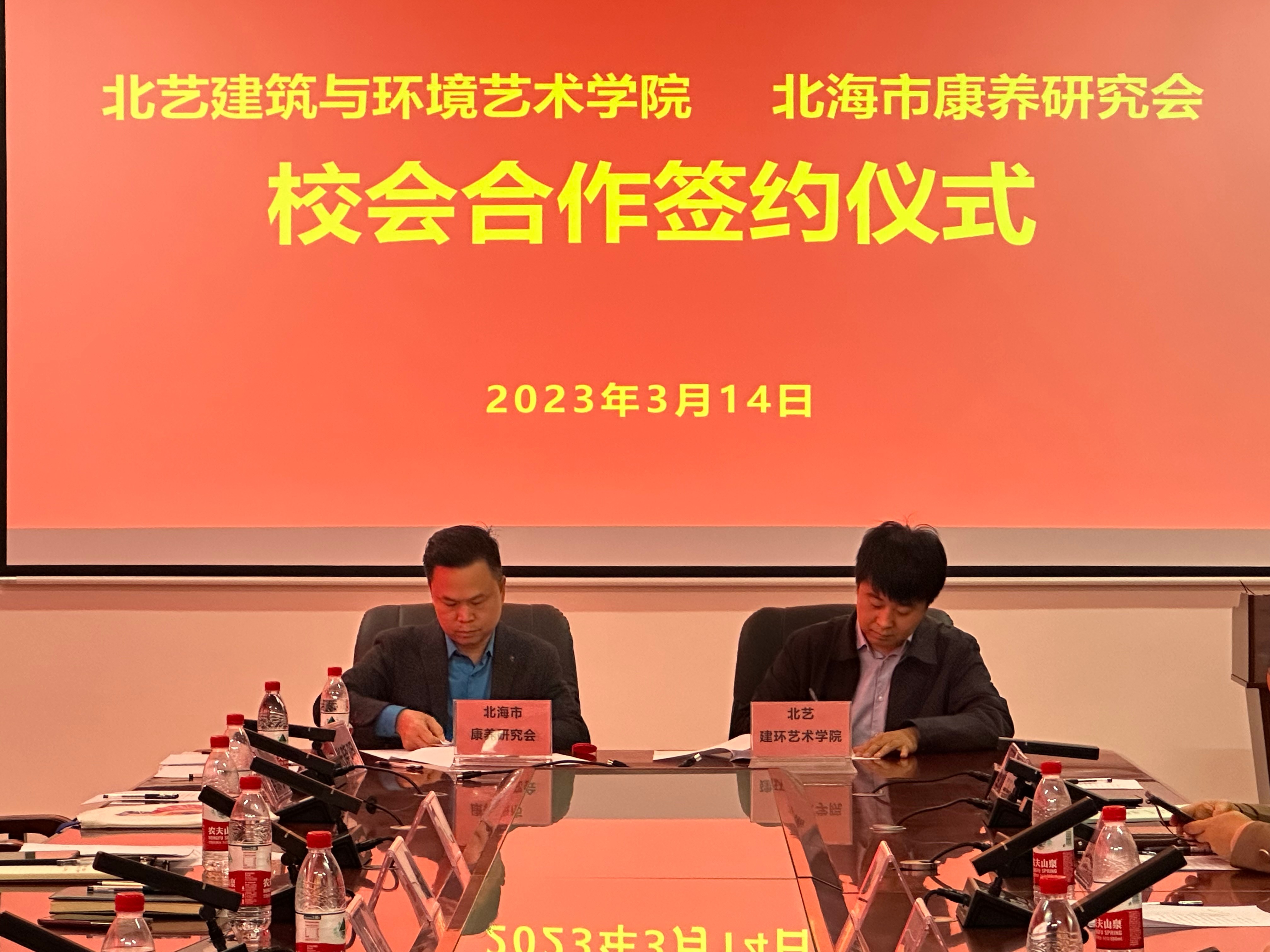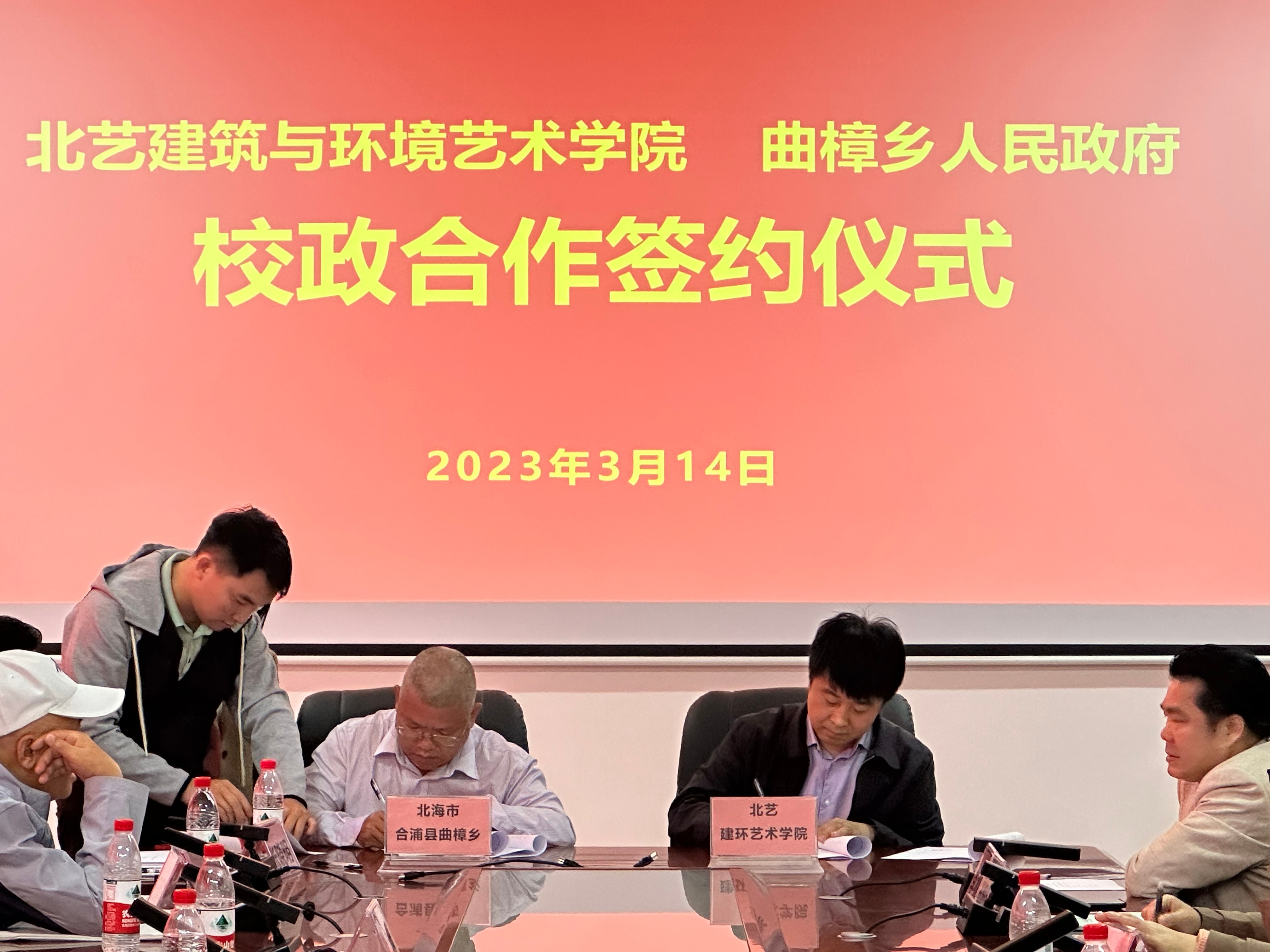 2023年3月31日,北艺建筑与环境艺术学院蔡世伟副院长等学院领导与学校领导赴北海市合浦县曲樟乡参加“政产学研”农文旅融合发展洽谈会,并举办建环学院实践教学基地挂牌仪式。本次活动由曲樟乡人民政府主办,北海艺术设计学院、北海市康养研究会联合举办,桂林银行北海分行和广西深蓝食品公司、北海麦香信息科技有限公司等单位参加。