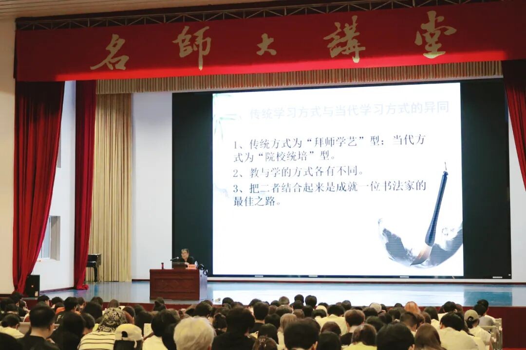 李和生教授从三个维度给出具体指引:一是强调养成自主学习习惯的重要性,在课堂之外要主动加强书法练习,同时注重对学习内容的思考与总结,实现“练”与“思”的有机结合;二是倡导运用综合知识体系分析书学理论与书论观点的准确性,以“创新”与“出新”的区分为例,明确“创新需融入个人理解与独特风格,而非对传统书法的盲目改造”,引导学生树立科学的创作理念;三是提出系统学习中国书法史的必要性,引导学生深入了解各历史时期代表书家的核心艺术成就,并推荐《中国书法史》《历代书法论文选》等经典著作,建议学生通过精读提升专业理论素养。 随后,李和生教授全面阐述了书法学习的多重价值与意义。他表示,书法作为中国传统文化的重要载体,承载着千年文化基因,学习书法必须以敬畏之心对待每一个汉字,切实承担起文化传承的责任。同时,他结合未来社会发展趋势指出,在科技高度发达的时代背景下,个人要想立足社会,需通过书法学习修心养性,提升艺术鉴赏能力与审美水平;强调书法学习不可急于求成,需秉持踏实专注的态度,兼顾理论学习与实践练习,实现知行合一。此外,李和生教授还结合自身从业经历,向学生介绍了书法专业广阔的就业前景,为学生未来职业发展提供参考。 讲座尾声,李和生教授针对学生提出的“如何避免书法学习走弯路”“怎样准确开展读帖与临摹练习”等实际问题,结合自身多年教学与创作经验,以专业视角逐一解答。现场答疑既有理论高度,又具实操性,帮助学生厘清了学习中的困惑,进一步激发了师生对书法学习的热情与兴趣。 此次讲座不仅为我校师生提供了与书法领域专家面对面交流的机会,也助力师生深化了对大学书法学习的认知,对推动我校书法文化传播、提升学生人文素养具有重要意义。讲座在全体师生的热烈掌声中圆满结束。(范佳涵 摄)
