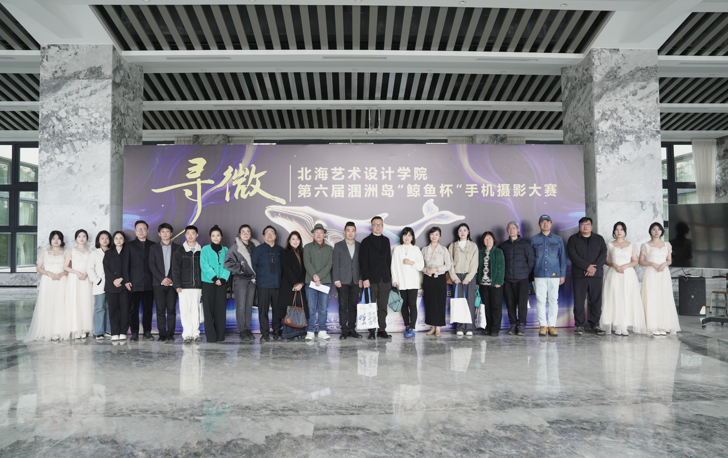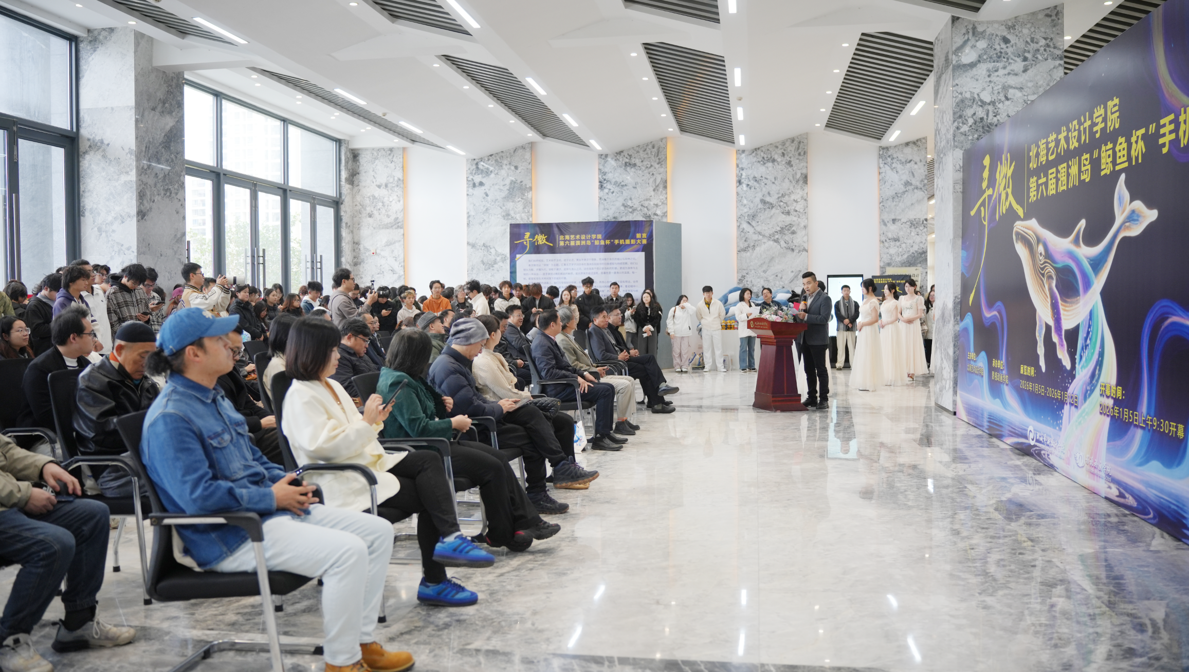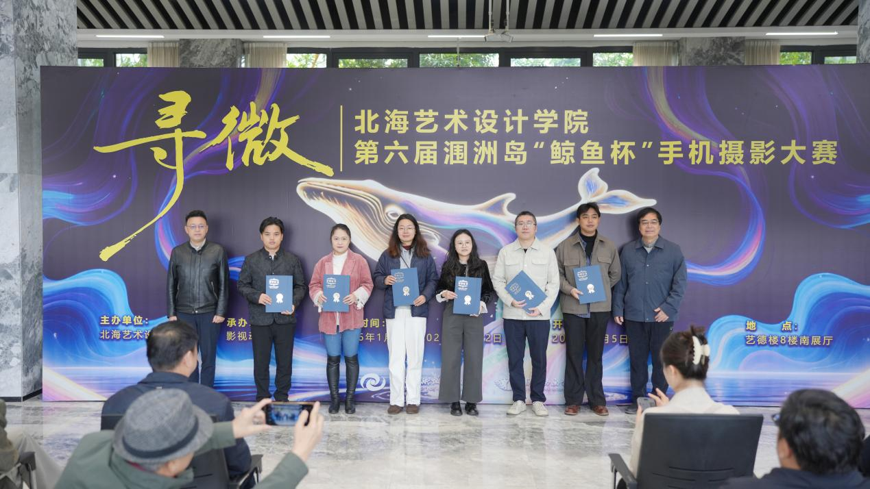 12月25日上午,第六届涠洲岛“鲸鱼杯”手机摄影大赛作品展开幕式暨颁奖仪式在艺德楼1楼举行。本届大赛以“寻微”为主题,由北海艺术设计学院主办、影视动画学院承办。学校党委书记覃宪儒,校长卢新华,副校长陶立阳、邱杰、包建明、何煜等校领导出席活动。活动还邀请了中国传媒大学赵晖教授、广州美术学院陈赞蔚教授、北京联合大学陈世红教授、北京电影学院孙平教授、吉林动画学院葛莹莹教授、青海师范大学袁志祥教授、广西艺术学院陈雷教授、南宁师范大学刘晓东教授,以及北海华彩文化传媒有限公司总经理陈丛越、北海市融媒体中心主持人李超等高校与行业嘉宾莅临指导。学校各二级学院负责人、专业带头人及师生代表共同参与开幕式。活动由影视动画学院院长助理邱红叶主持。