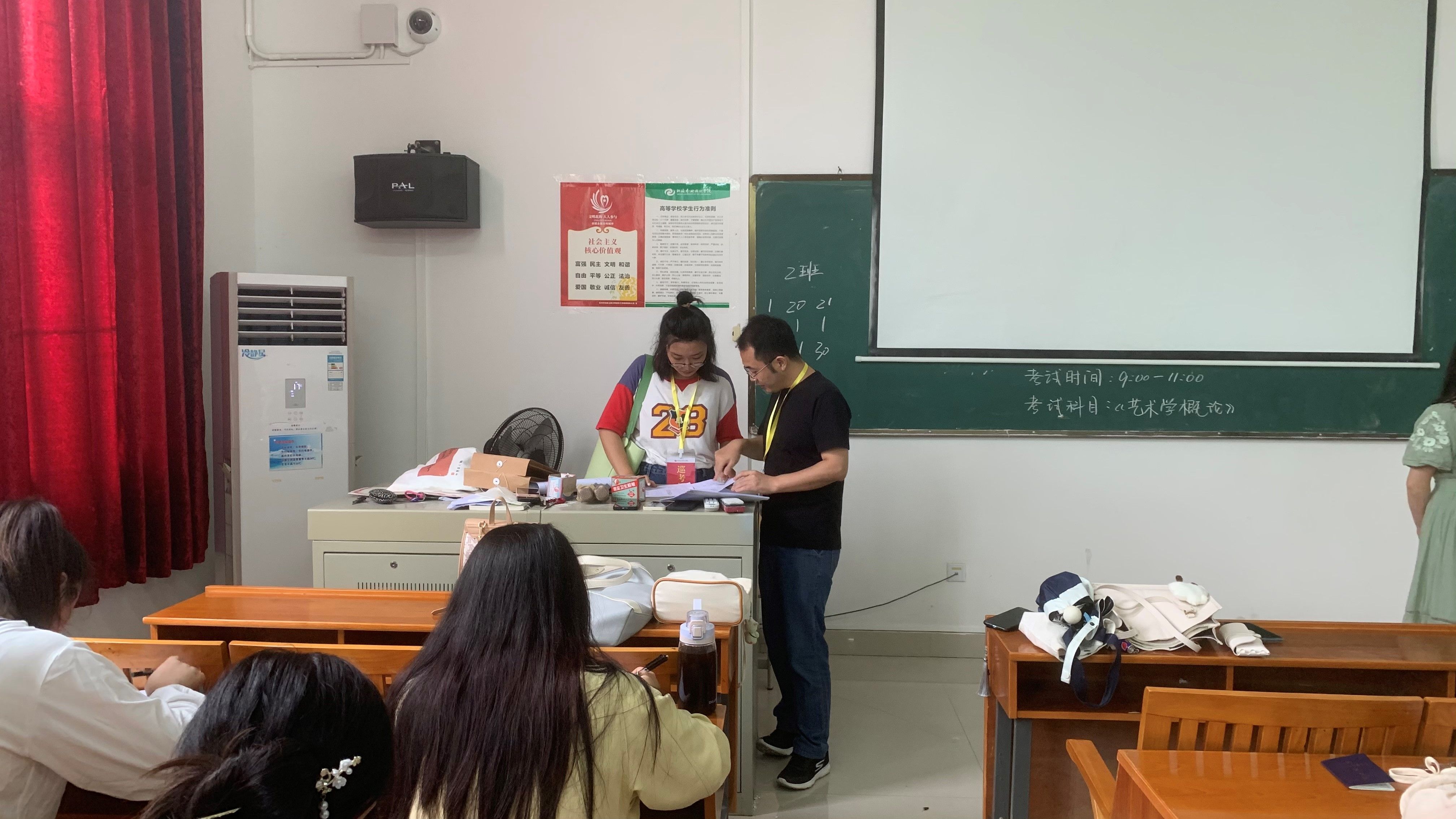 根据学校教学工作统一安排,美术学院于6月9日至6月12日开展本学期专业课程期末考试。期间,北海艺术设计学院副校长胡胜,教学质量监控办公室副主任郑岩,美术学院党总支书记韩玮,美术学院副院长龚为,综合办主任肖玺,综合办副主任陈建江,绘画专业负责人张湘中,雕塑专业负责人金凯婧,摄影专业负责人李炫勋,在考试中往返于功德楼、伦理楼各考场,进行美术学院专业课程期末考试巡察工作,并与考务人员进行深入交流,对考场布置与秩序维护等有关工作进行指导。(肖玺 摄)