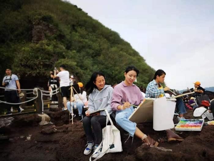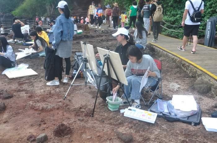 (火山口景区学生写生场景)