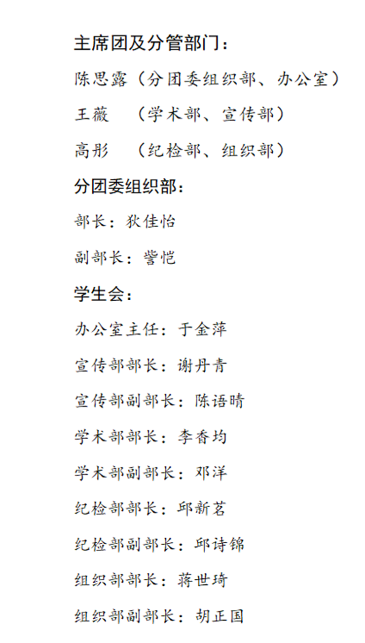 经过严肃、认真、公平、公开的选举,最终选举产生人文教育学院分团委第二届学生干部,具体成员名单如下:
