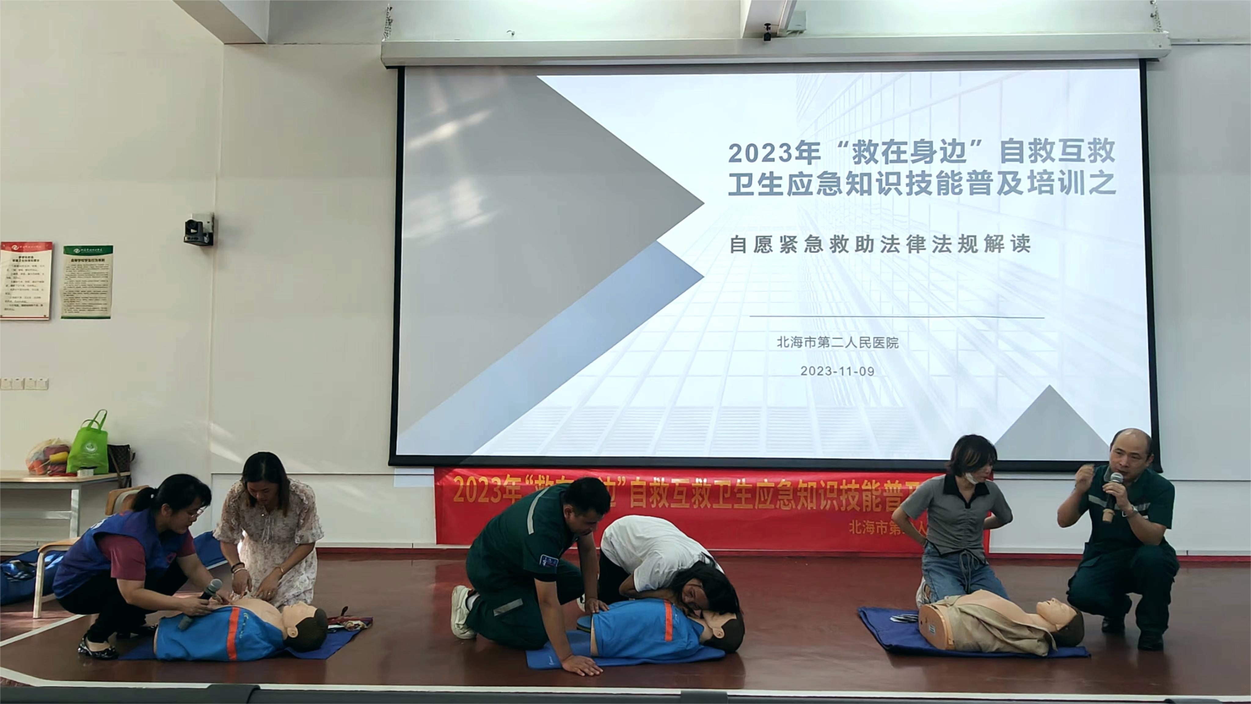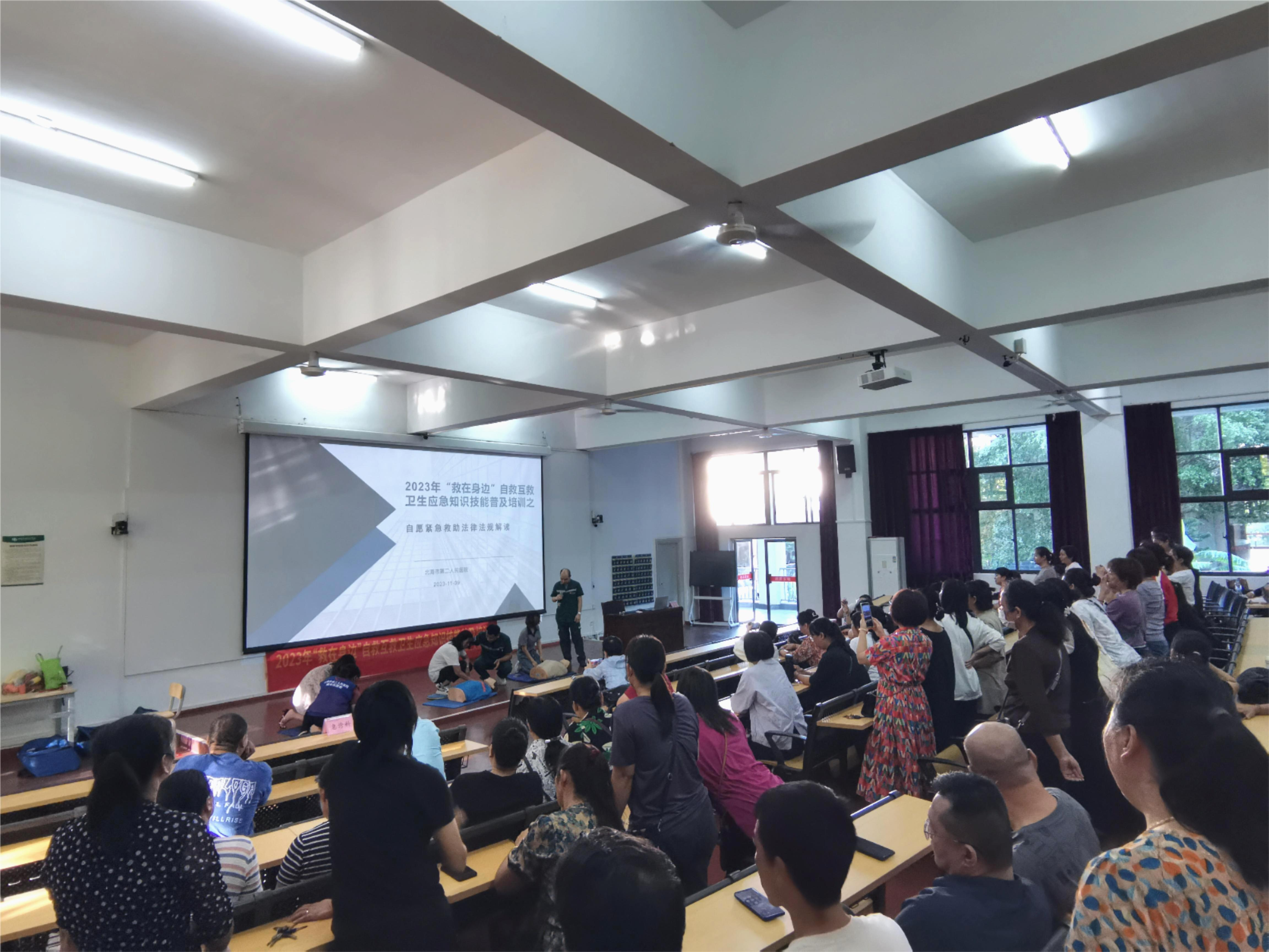 随着现代社会的发展,人们新的生活模式结构下,在生产、学习、生活环境中发生的危重急症、意外伤害愈来愈屡见不鲜,为提高我校教职员工的急救意识与现场急救能力,11月9日下午,我校组织开展自救互救卫生应急知识技能培训。培训由周晓敏老师主持,北海市第二人民医院的鲁玄主任、黄焱医生及蒙春良主管护师分别进行了应急救护知识讲授,并现场演示了心肺复苏术、气道阻塞的现场急救、创伤止血包扎技术及实操指导。通过此次应急救护知识技能培训,加强了我校教职工对急救技能的了解,也为我校应对突发事件,及时、有效开展现场救护积累了经验。