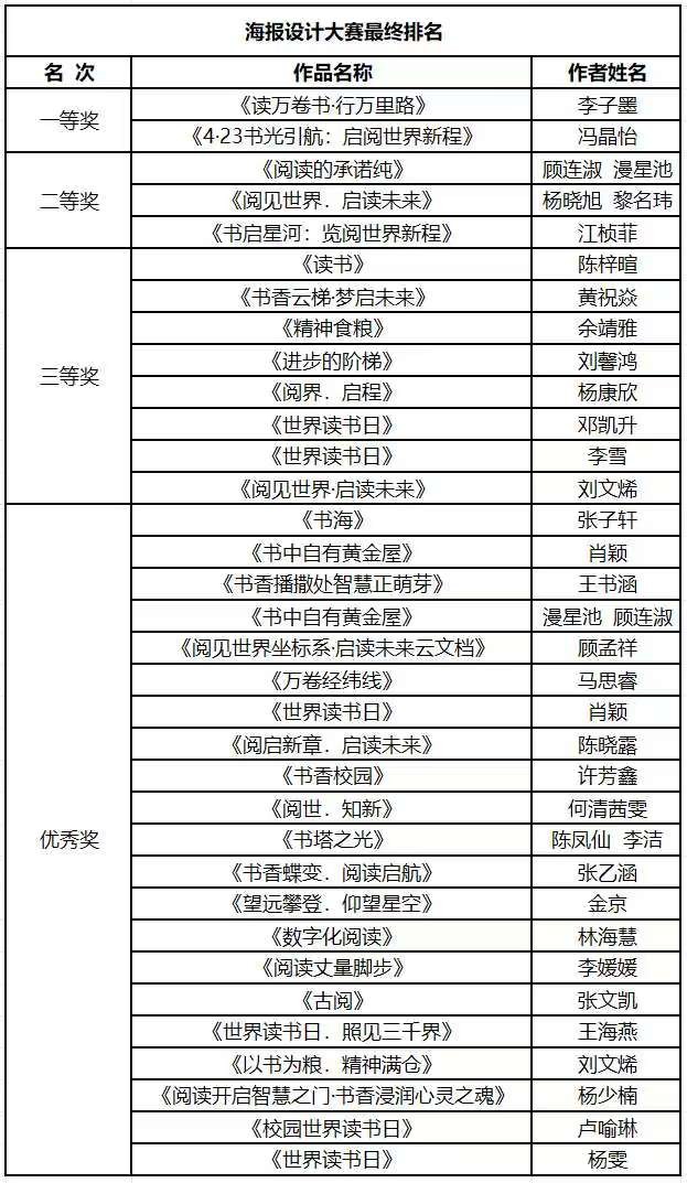 作为重头戏的“世界读书日”校园海报设计大赛首次设立纯设计与AIGC双赛道,这也为同学们的海报创作提供了新的设计思路。评审老师介绍:“参赛作品在创意表现、技术应用等方面有较高的水准,特别是AIGC赛道作品将人工智能与传统设计完美融合是一次特别的创作尝试。”经专业评审团三轮遴选,海报设计共有三十四人次获得各类奖项,获奖名单如下: