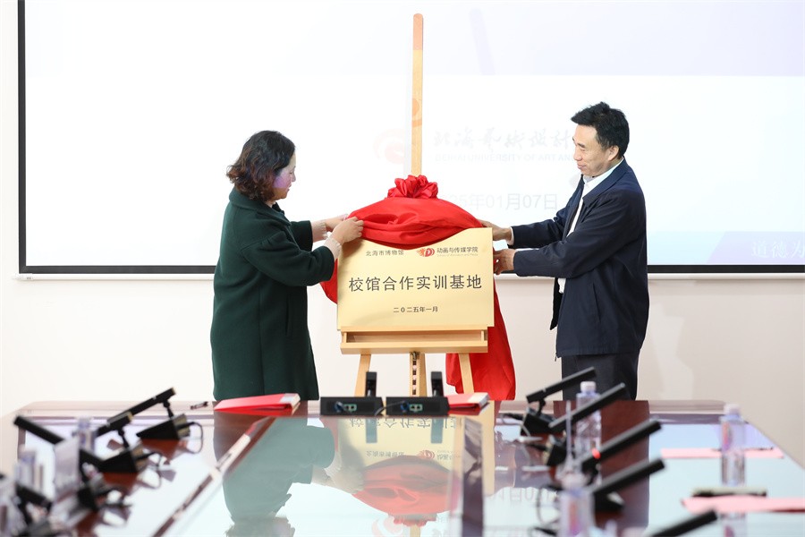 在热烈的掌声中,双方签署了合作协议,共同为“校馆合作实训基地”揭牌,标志着动画与传媒学院与北海市博物馆校馆合作实训基地的正式成立,双方的合作迈入了实质性的新阶段。