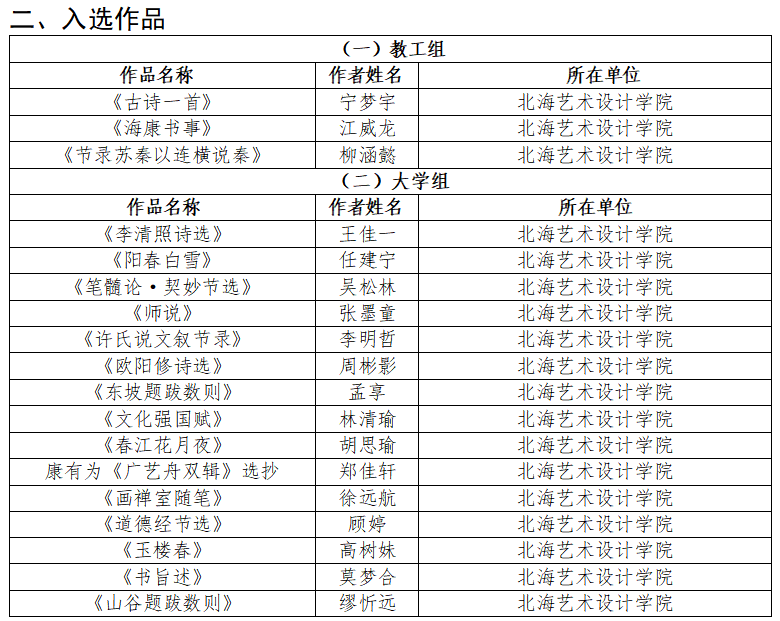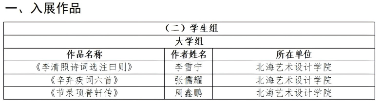 近日,“园丁杯”广西教育系统第十届书法篆刻作品展展览评审结果正式公布,我校书法学院共有21名师生凭借扎实的专业功底与优秀的创作水平成功入选、入展。其中,李雪宁、张儒耀、周鑫鹏3名学生作品入展;宁梦宇、江威龙、柳涵懿3位专业教师及王佳一、任建宁等15名学生作品入选。